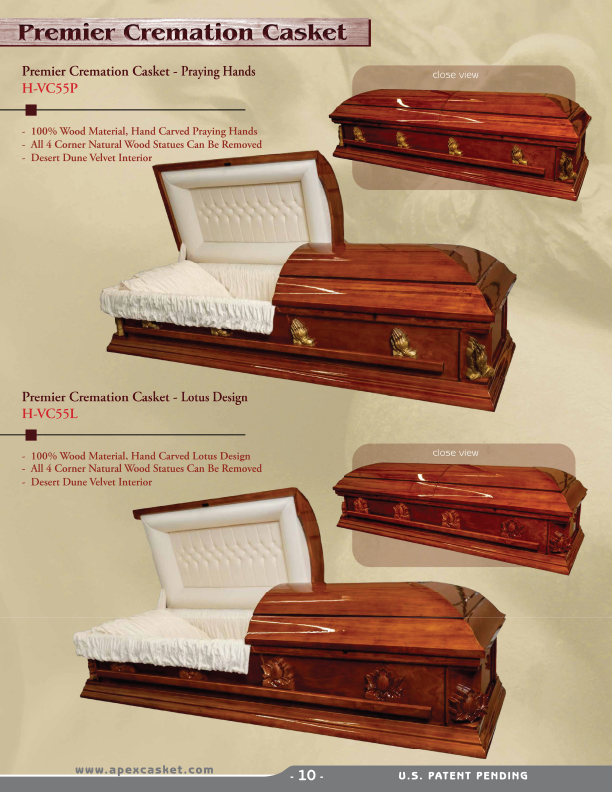 PremieCremation casket with praying hand wood carved